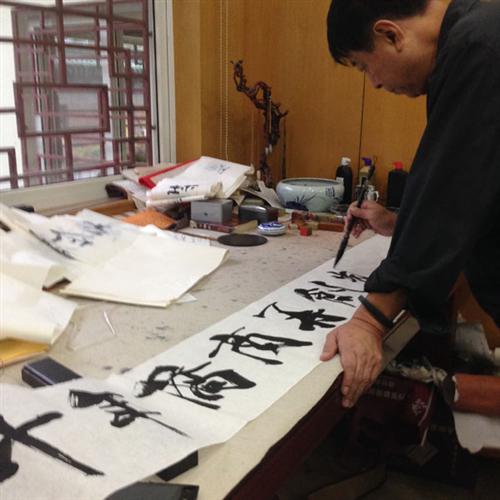 走进静庐艺术中心,清雅的墨香扑面而来,魏建勋老师的书画室内布满了他各类书法创作作品:行、楷、草、隶、篆。仅《大风歌》作品就用多种字体创作,随着书写内容情境的改变而调整书法风格,布局神闲意定,雍容大度,。在与我会成员交流书法心得时,魏老师愈感自身的不足,他说习书法得有神有骨,书法固然以形式美打动人心,但也不可忽视书写内容的精神性。在得悉今年12月南京市侨商会即将迎来成立十周年庆典,魏建勋老师铺开纸模,以他最擅长的行草写下“十年侨商 再创辉煌”。