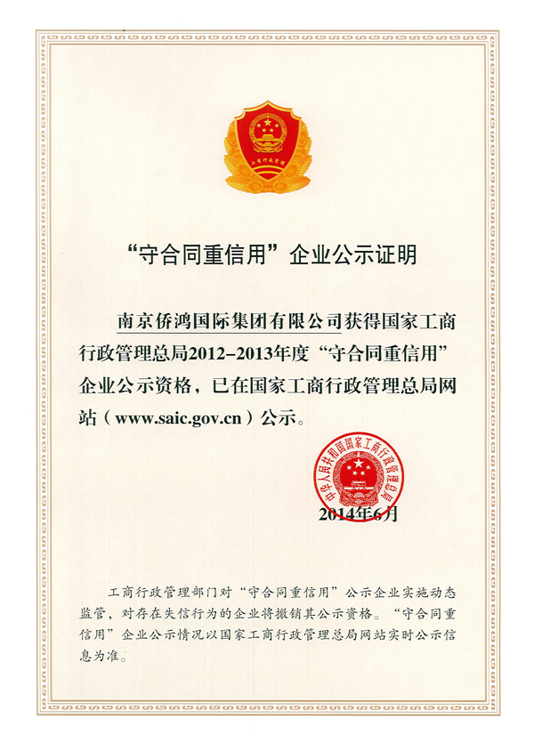 经国家工商总局批准,南京市侨商会创会会长单位,南京侨鸿国际集团日前以高分获评国家级“守合同重信用单位”称号,这是继2007年集团首次荣获该项称号以来,连续第三次获此殊荣。本次全国“守合同重信用”单位的评选工作由国家工商总局牵头,各省、自治区、直辖市工商行政管理局组织推选历年来辖区内优秀的守重企业参与评选。本次与侨鸿集团一同获评的企业还有南京禄口国际机场有限公司、南瑞集团、扬子江药业集团等各行各业的龙头企业。 该项国家级荣誉的申报涉及市级、省级再到国家级逐级申报与评审,几百项考核指标皆以数字评分机制模块化测评,获评难度很大。为此,侨鸿集团一方面在日常工作中大力巩固执行现有合同管理制度、更新标准格式合同库,同时形成定期检查的动态管控机制,另一方面保持与多级评审机构的联络,细致了解评审条件,寻找企业信用管理优势与评审要求的结合点,最终不负众望,又一次获得“全国守合同重信单位”称号,这项企业经营领域中的最高荣誉之一。 本次连获国家级“守合同重信用单位”称号再一次证明侨鸿国际集团的企业信用管理工作处在同业领先水平,全体侨鸿人也必将以此为契机持续打造独具侨鸿特色的信用文化。