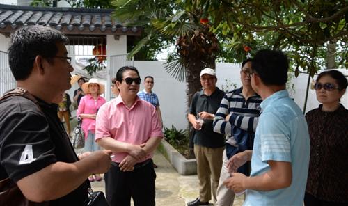 上午9点,参加活动的成员在秘书处带领下兴致勃发地踏上了旅途,一路谈笑风生、神采飞扬。一进入活动首站——“红楼稻香村”村口,大家就深深地被眼前的景色所吸引住了:乡间道路蜿蜒曲折,路边青葱翠绿中洒满了星星点点野花。这般淳朴与清新是平日里身处繁华的人们所难得一见的。进入村庄,广阔成片的农田、干净整洁的巷道、鳞次栉比的明清瓦房、家家门前的楹联,还有刘姥姥茶馆的雕塑,都给大家留下了深刻的印象。说到“红楼”与“刘姥姥”,原来此处与《红楼梦》还有着不解的渊源。据红学学者研究,此处山川地貌及风土人情跟《红楼梦》中的相似度多达180多处。大家还在村干部引导下参观了当地的农村文化活动室和两户农家,深切的感受到南京市新农村建设给广大农户带来的实际利益。