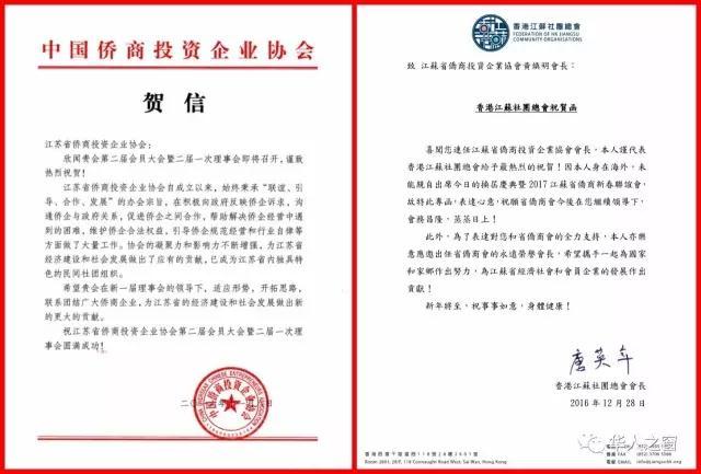 此次活动得到了侨界的广泛关注,中国侨商投资企业协会、中国侨商联合会、香港江苏社团总会会长唐英年等侨界组织及个人纷纷发来贺信对此次活动表示支持与祝贺。