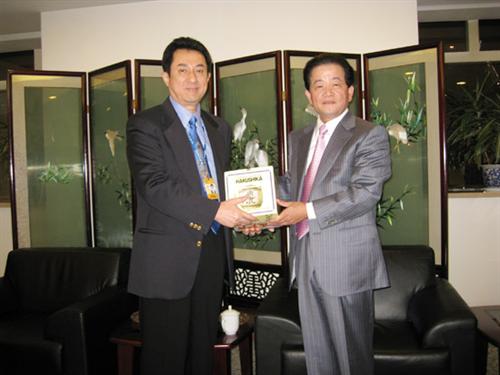10月13日下午,日本著名友好人士、an ka she公司社长河合保先生一行在八重樱文化体育交流信息有限公司董事长韩金龙先生的陪同下,拜会了南京市侨商会会长、侨鸿国际集团董事长傅伟先生。傅先生对河合保先生一行的到来表示欢迎,介绍了自己十几年来在南京工作的一些体会,南京是一个富有朝气的城市,充满着活力,文化底蕴深厚,南京人团队合作意识强,人才辈出,员工优秀。河合保先生对傅先生担任会长期间,侨商会取得的发展表示赞赏,并表示,他对中国人民有着深厚的感情并长期致力于促进中日两国经济文化交流不断发展。尽管近期金融风暴席卷全球,河合保先生仍然决定进一步扩大在宁投资规模,并将其在南京的中日合资公司注册资本扩大至原来的四倍,以增强公司立足南京长期发展的信心与决心。傅先生对河合保先生在南京扩大投资表示祝贺,并借河先生60寿辰之际,祝愿河合保先生事业发展顺利,也祝愿中日友谊长存,不断谱写友谊新篇章。